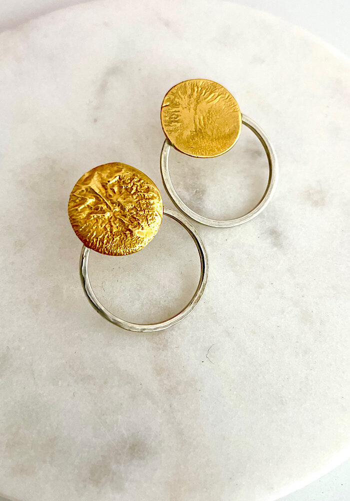 Sterling silver (silver 925) gold plated hammered discs in 24K. Designed and textured by hand.